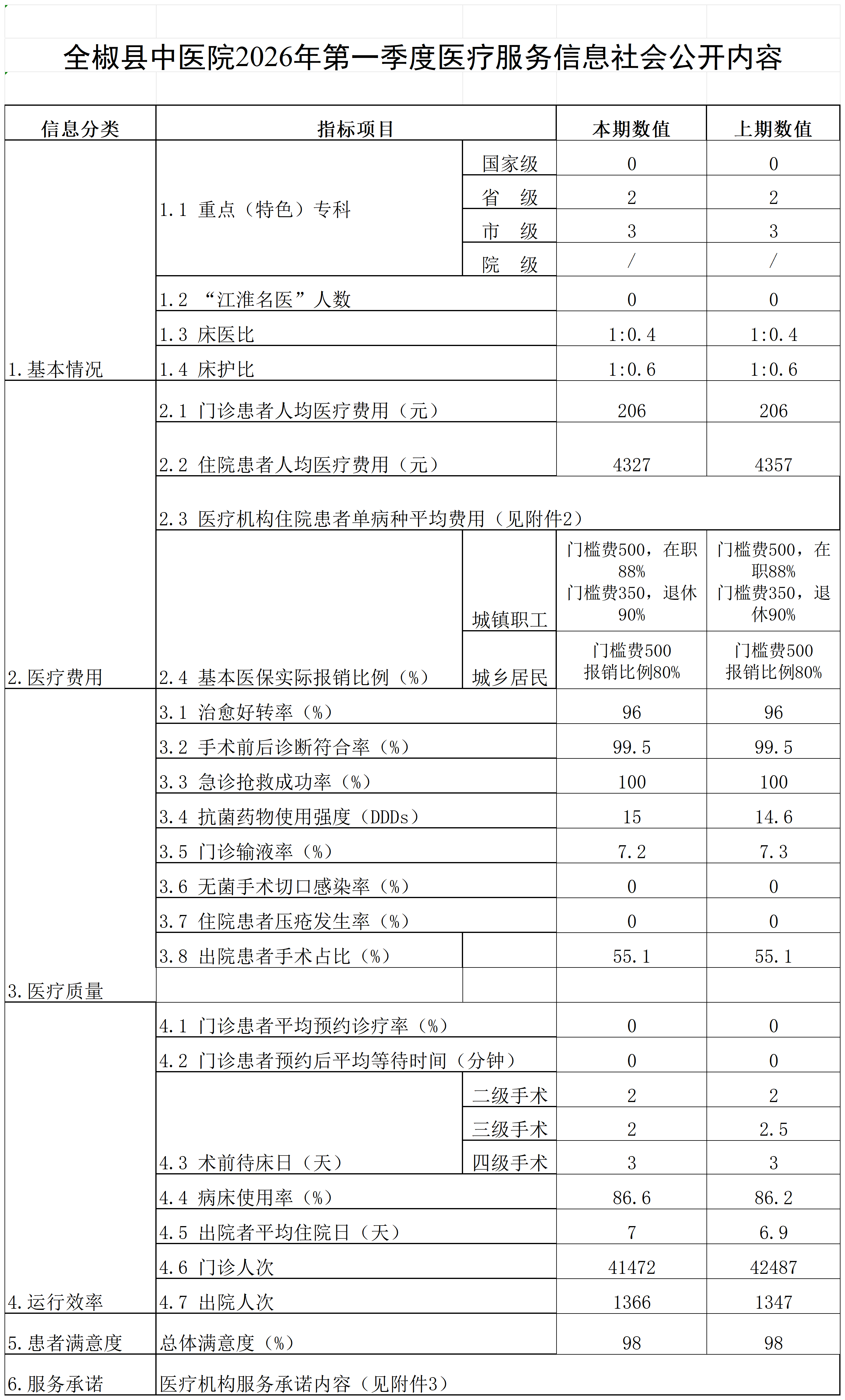 全椒县中医院2026年第一季度医疗服务信息社会公开内容