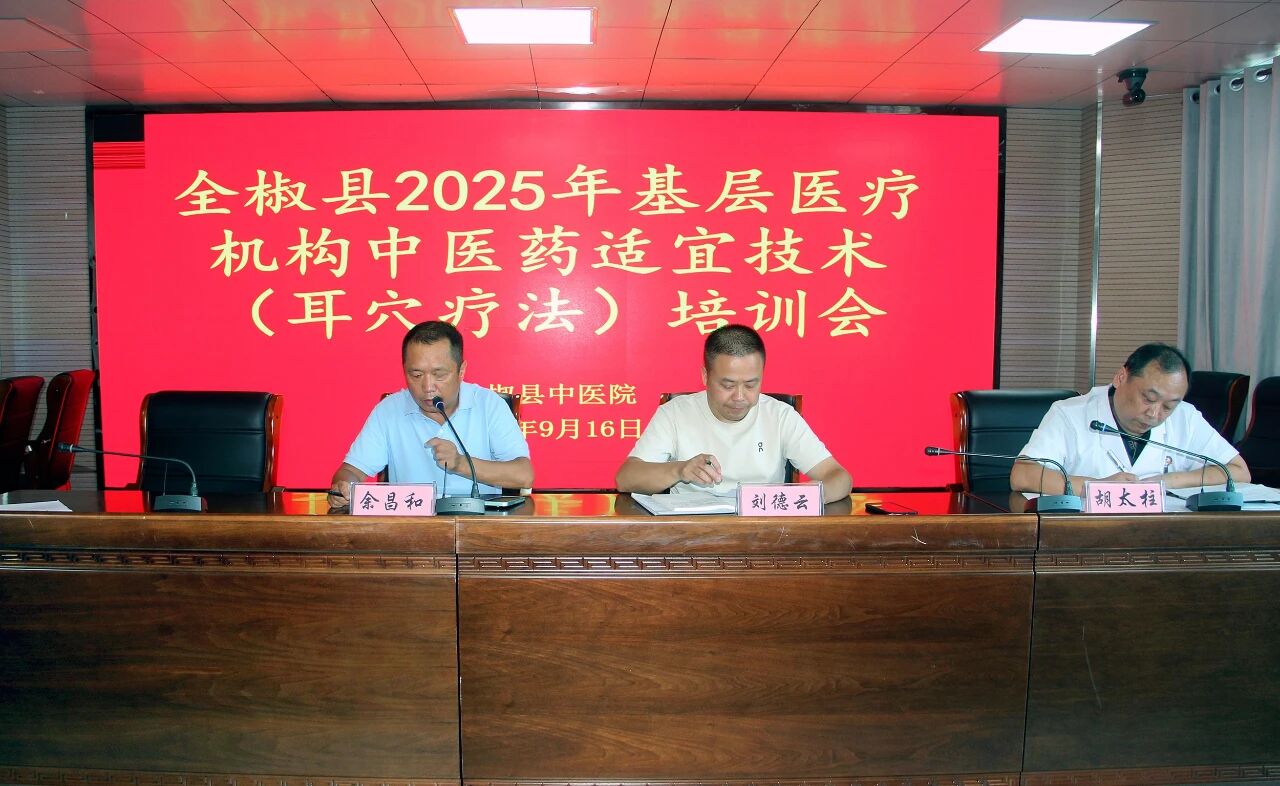 为全面提升我县基层医疗机构中医药服务能力,深入开展中医药适宜技术推广应用工作,9月16日,由全椒县卫健委主办、县中医院承办的2025年全椒县基层医疗机构中医药适宜技术(耳穴疗法专项技能)培训班在县中医院举行。县卫健委分管领导余昌和、县中医院党委书记刘德云、培训班学员等120余人参加。会议由县中医院副院长胡太柱主持。